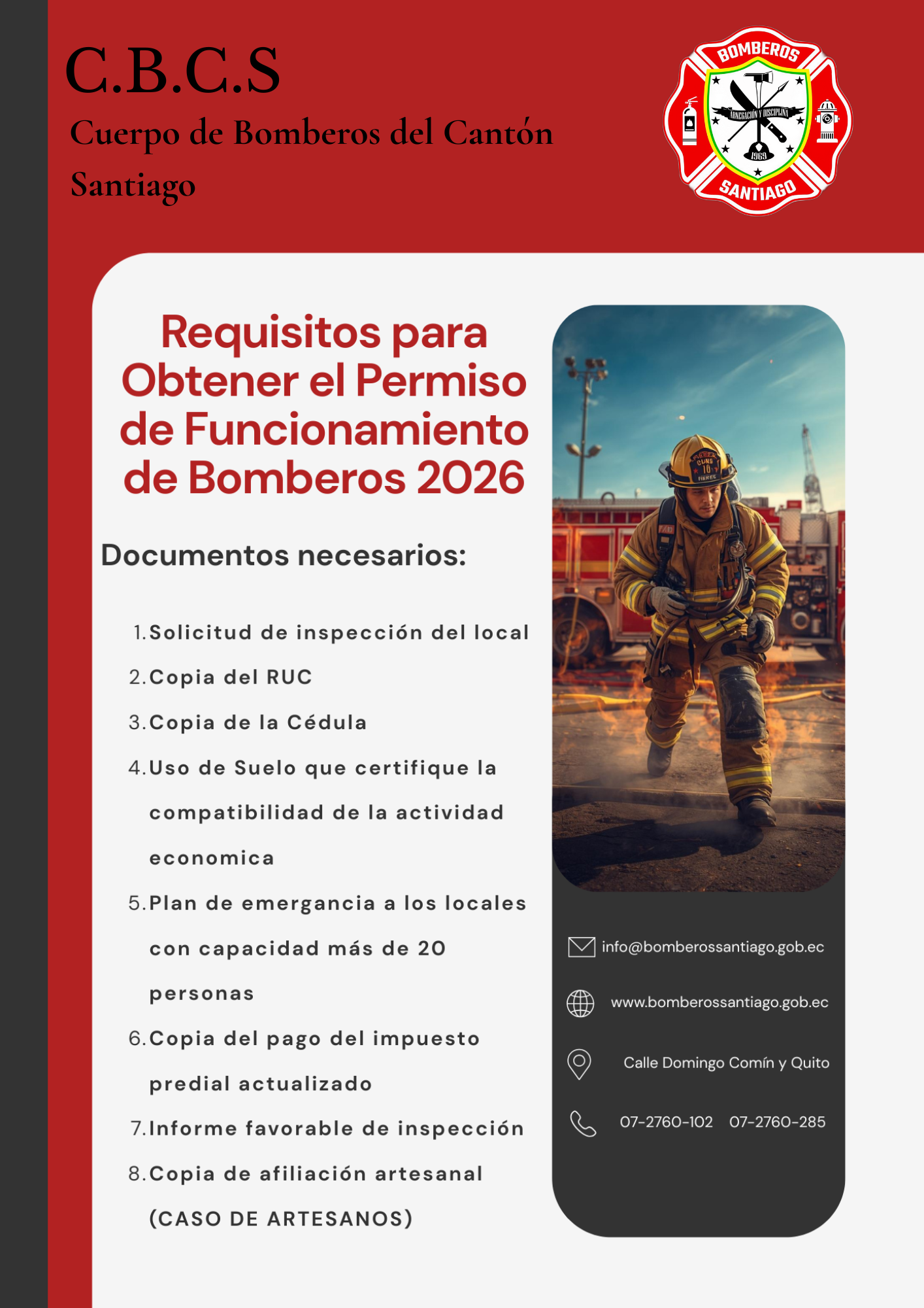 l Cuerpo de Bomberos del Cantón Santiago informa a la ciudadanía que ya se encuentran establecidos los requisitos necesarios para la obtención del Permiso de Funcionamiento de Bomberos correspondiente al año 2026.